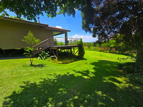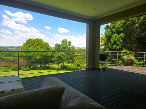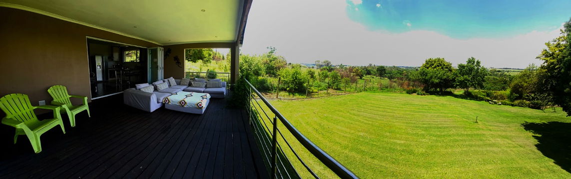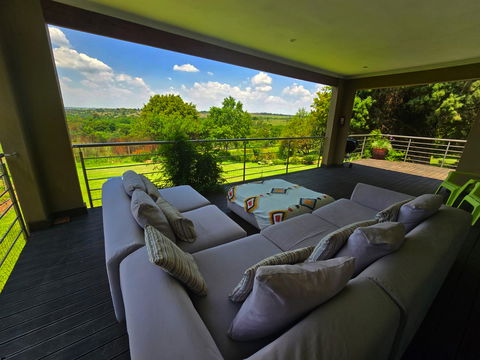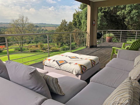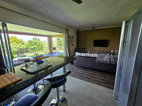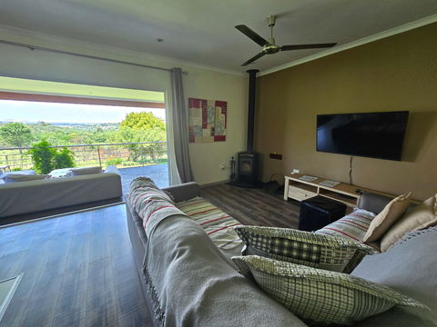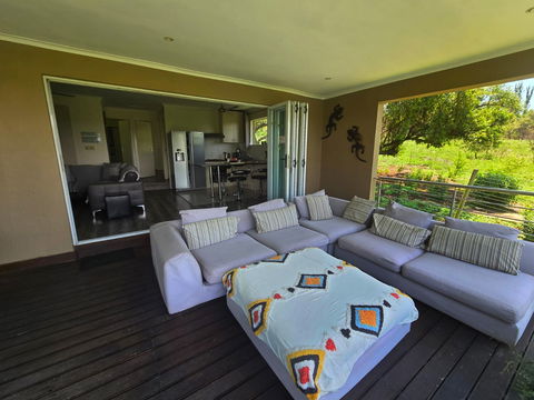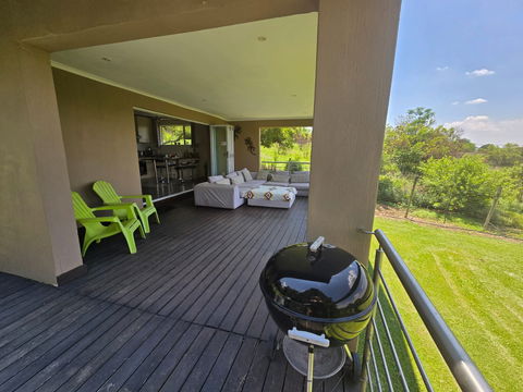The retreat features a fully equipped kitchen, a cozy lounge with fireplace and DSTV, and a generous deck complete with a weber braai—perfect for relaxed meals and evenings together.