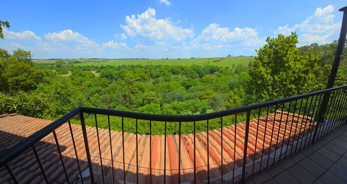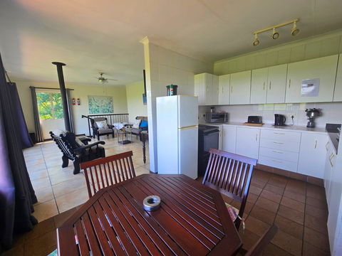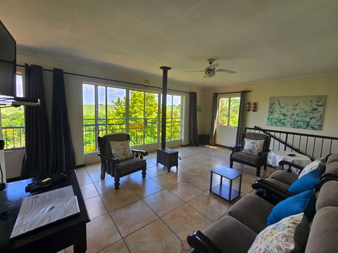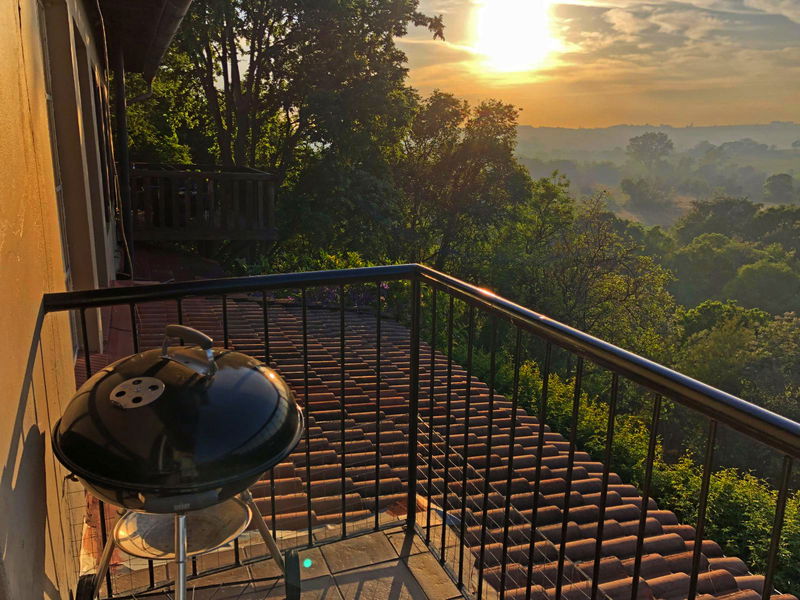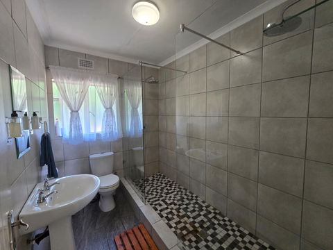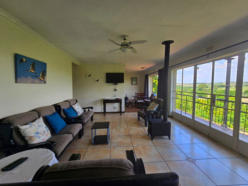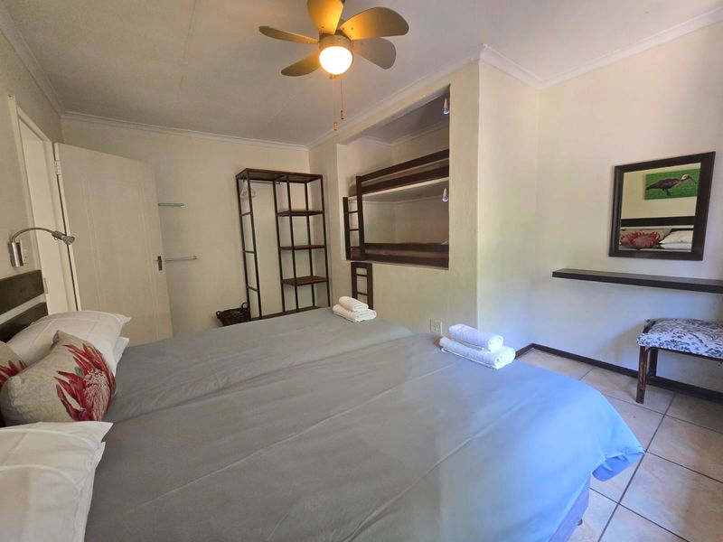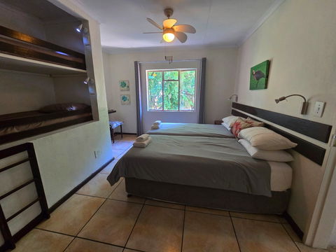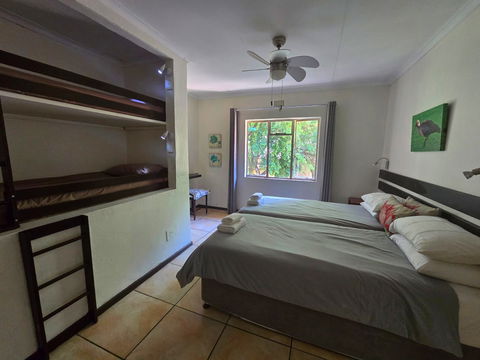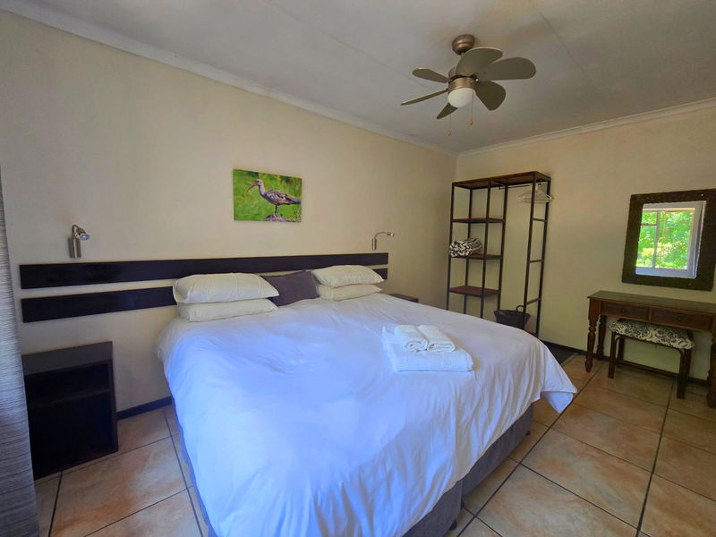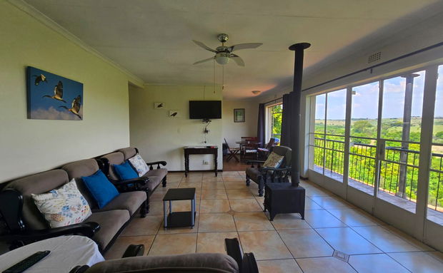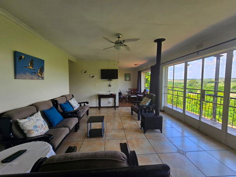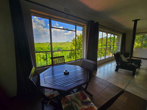 Set upstairs with sweeping views of the river and hills, Hadeda Lodge offers a warm and spacious escape. The lounge features a cozy fireplace, and the covered verandah—with a weber braai and camp chairs—is the perfect spot to enjoy a sundowner or morning coffee while soaking in the scenery.