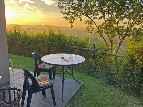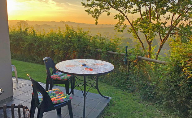 The well-equipped kitchenette opens onto a private patio with a brazier, weber braai, and a small fenced garden—perfect for quiet mornings or relaxed evenings by the fire.
